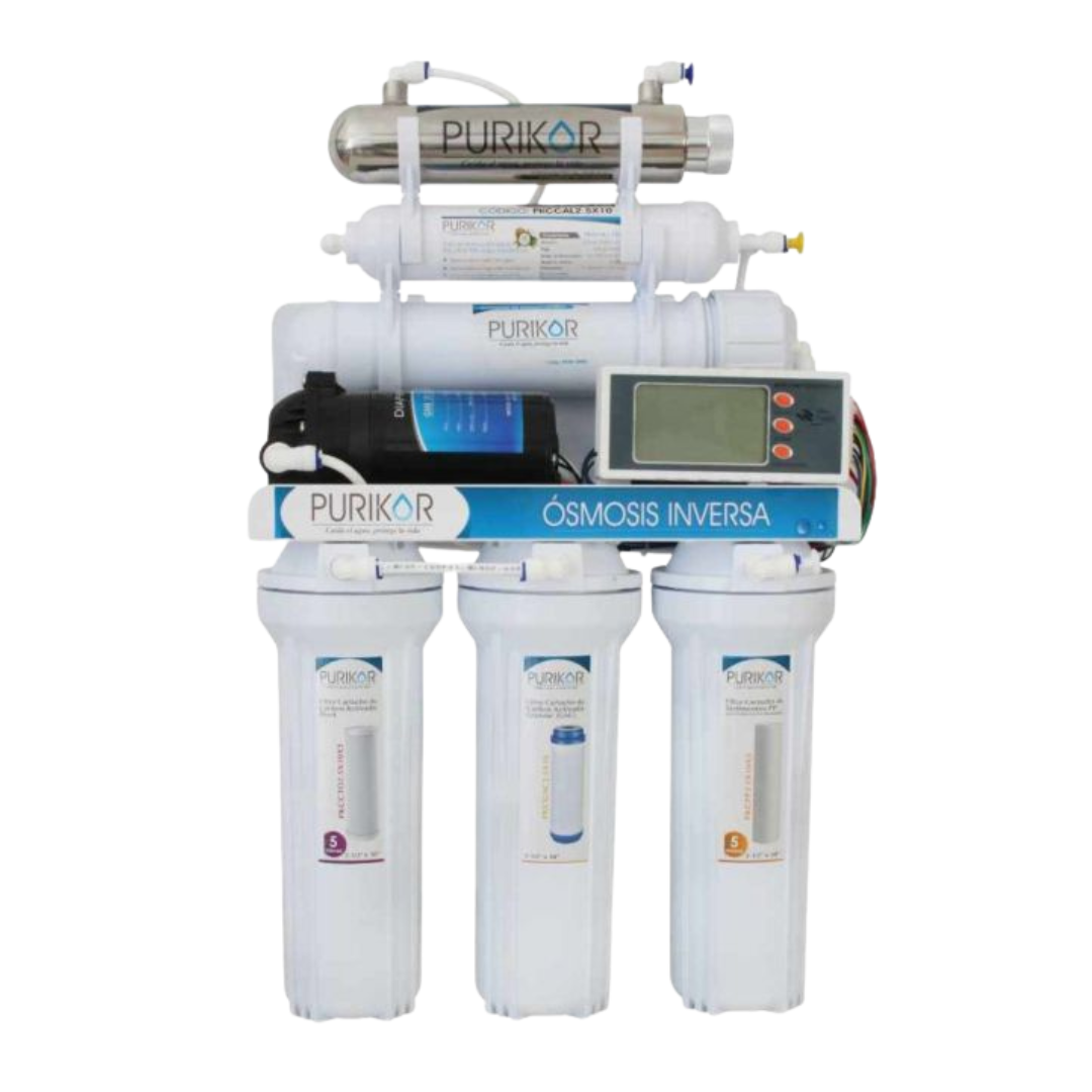 El Sistema de Ósmosis Inversa Purikor de 6 etapas con bomba, luz ultravioleta y medidor TDS está diseñado para brindar agua purificada de máxima calidad para consumo humano. Su avanzada tecnología elimina sedimentos, cloro, metales pesados, microorganismos y otras impurezas, garantizando un sabor puro y seguro. El sistema integra una lámpara UV PHILIPS que proporciona una desinfección adicional al eliminar virus y bacterias resistentes, ideal para hogares, comercios e industrias que requieren agua limpia constantemente.